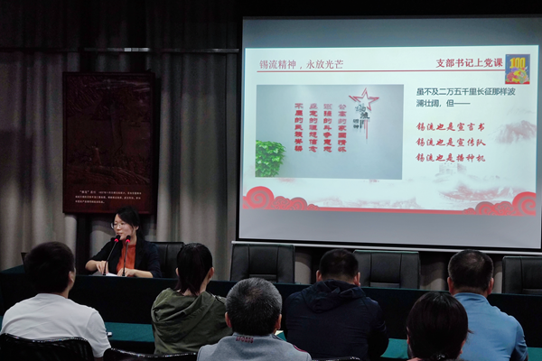 在无锡“第一支部”党建基地,后勤党总支全体成员参观了新中国无锡第一面五星红旗升旗处,瞻仰了秦起烈士铜像、第一支部会址群雕等。基地二楼的革命史画,浓缩了无锡人民在中国共产党领导下进行革命的奋斗历程,12位杰出的无锡共产党人生平,展现了无锡儿女在革命和建设年代作出的辉煌业绩。随后,后勤党总支第二党支部书记吴香菊同志为全体党员带来了一堂以“锡流精神,永放光芒”为主题的党课,党员同志们跟随红色足迹回到了无锡沦陷前夕的那段历史,同志们深深被锡流所展现的家国情怀、坚定信念、斗争意志和民族精神所感染。