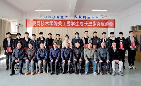会议由分院关工委秘书刘雄主持,物联网技术学院党总支副书记、二级关工委副主任徐锋老师对2019年物联网学院关工委工作进行了回顾总结与汇报;校关工委领导王怀宝老师对我院关工委工作作了点评,对一年来取得的成绩予以肯定,同时对分院关工委工作进行了指导,并提出要继续推进二级关工委优质化建设、充分发挥各类特色平台作用;随后,2019年在学习、生活、思想、行为等方面取得较大进步的15位同学分别作了成长进步事迹分享,接受了老同志们颁发的“成长进步奖”证书,师生们还就思想、学习、生活等方面问题进行了互动交流,物联网技术学院党总支书记、二级关工委主任周陆飞老师勉励上述获奖同学继续努力、不断进步,同时将继续推进二级关工委常态化、优质化建设。