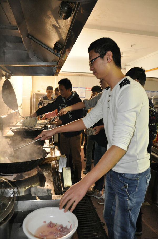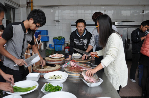 现场比赛分为三组,每组由6名选手组成,需要完成1道特色菜、2道必选菜、4道自选菜。在两个半小时的比赛中,同学们分工合作,认真的拣菜、洗菜、切菜、炒菜,配合默契,均完成了7道菜的制作。经过评选,曹刘同学制作的“水煮肉片”、“啤酒鸡腿”,陆宇正同学制作的“红烧鲫鱼”获得一等奖,第一组获得最佳团体奖。活动中老师们也积极参与,献出了自己的拿手菜,杨雪琴老师精心制作的“红烧虾”备受欢迎。