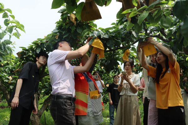 在大坊桥村村主任的带领下,学生党员参观走访了新吴区鸿山街道大坊桥村,学习大坊桥村“党建+美丽乡村”、全国首个村级“乡村振兴大讲堂”建设经验。随后,学生党员身体力行,前往“鸿心梨享园”开展志愿服务活动,帮幼梨套袋,防止果子遭受病虫灾害。