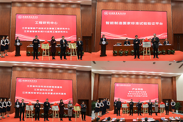 开幕式上,出席会议的嘉宾、企业代表和校领导共同为我校省发改委工程研究中心、智能制造国家标准试验验证平台、省科协智库基地、科协之家、哲社重点研究基地和产业学院等机构正式揭牌。龚方红校长代表学校与企业签订2项重大技术合作项目,总合同额达600万元,并接受西门子、比亚迪、蔡司、新大陆、瑞可特等5家企业的捐赠,捐赠的精密仪器、机床夹具及技术软件包等装备价值合计5080万元。