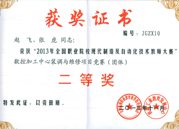 2013全国职业院校现代制造及自动化技术教师大赛于11月1日至3日在杭州举行。我校机械技术学院赵飞、张虎两位老师参加了高职组“数控加工中心装调与维修(团体)”赛项,经过两天紧张的实际操作竞技与教学设计答辩,最终获得二等奖,两位老师同时获得“全国机械职业院校实践教学能手”称号。