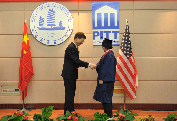 6月16日下午,我校中美合作办学项目首届毕业典礼在太湖校区国际交流中心二楼报告厅举行。在这场简洁而意义深远的毕业典礼上,有35名同学获得美国皮特社区学院专业证书,其中14名同学还获得了皮特社区学院的副学士学位。