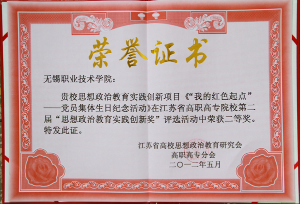 会上,我校获评“省高职院校思想政治教育研究工作先进单位”,老领导傅筠同志作了题为“党建工程为引领 强化主渠道建设”的交流发言。王国忠、杨雪琴、承剑芬三位同志被评为思政教育研究工作先进个人;《“我的红色起点“——党员集体生日纪念活动》被评为“思想政治教育实践创新奖”二等奖;王国忠主编《形势与政策教材建设研究》(教材)荣获“江苏省高职高专院校2010—2011年度思想政治教育优秀研究成果”一等奖。
