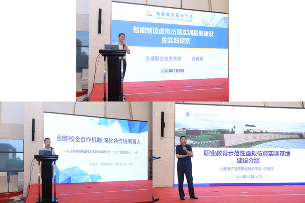 系列报告和经验分享环节,我校智能制造国家虚拟仿真实训基地建设负责人钱晓忠教授做了题为“智能制造虚拟仿真实训基地建设的实践探索”的专题汇报,从建设基础、建设思路、建设举措以及建设成效四方面分享了学校在虚拟仿真建设的经验与做法,为虚拟仿真实训室建设提供无锡职院方案。
