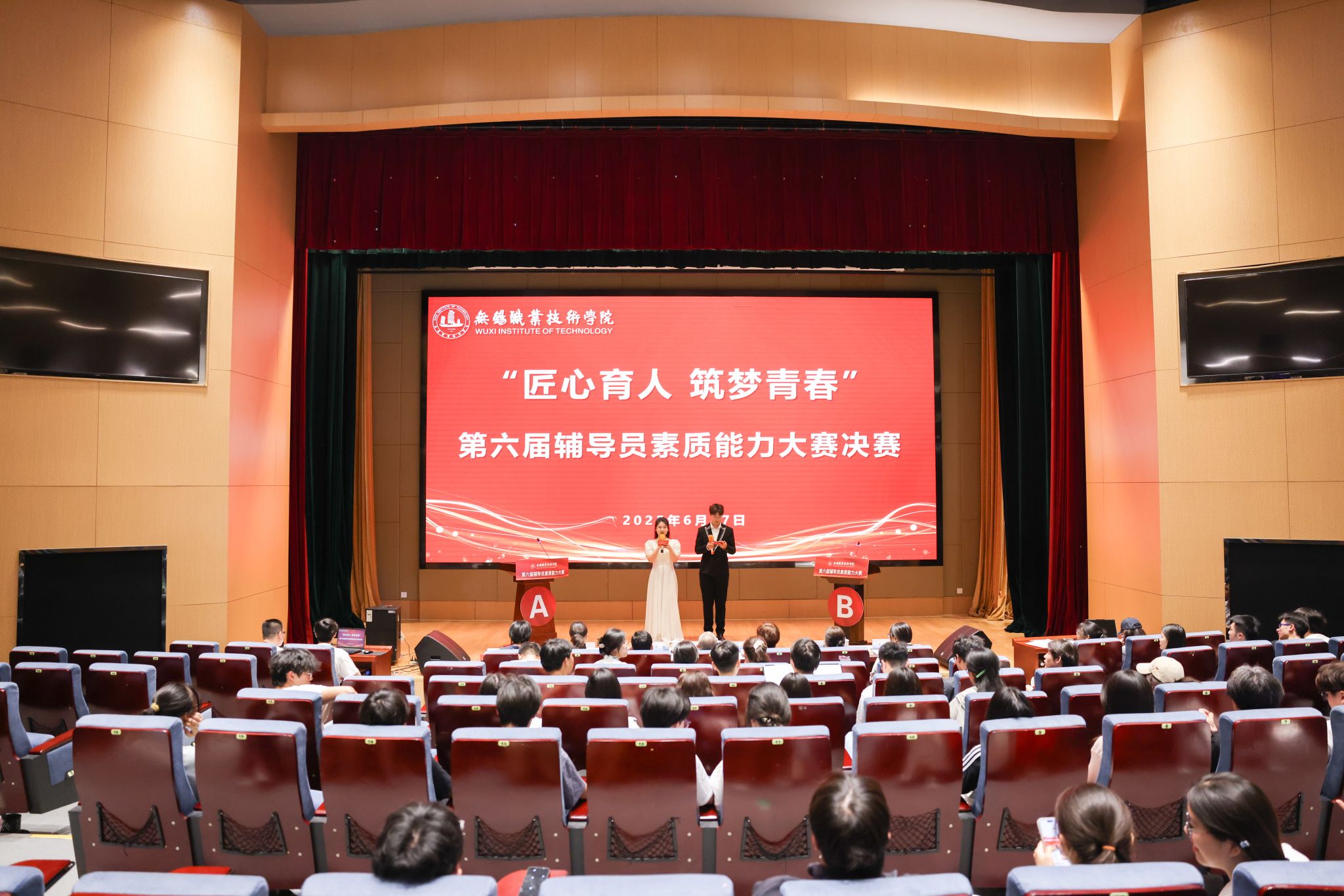 为全面贯彻落实习近平新时代中国特色社会主义思想,落实立德树人根本任务,不断提升我校辅导员的工作理论水平、职业能力和专业素养,推动辅导员队伍职业化、专业化、专家化发展,学校于6月17日下午在厚德楼辅楼一楼报告厅举办“匠心育人 筑梦青春”第六届辅导员素质能力大赛的决赛。副校长强伟纲,党委组织部、党委宣传部、学生工作处、校团委及二级学院等部门负责人担任评委,学校全体辅导员与学生代表到场观摩。