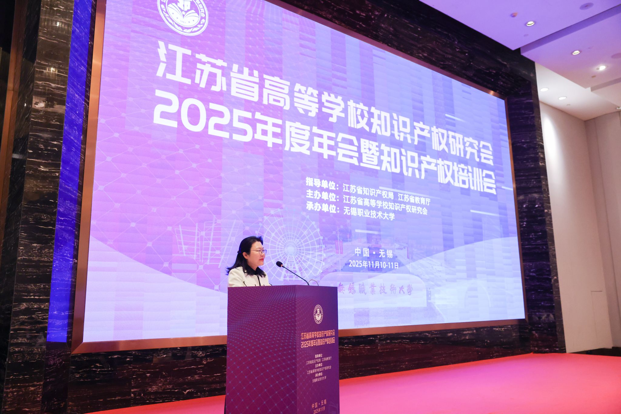 王英介绍了无锡市知识产权工作的整体布局与发展优势。她表示,无锡作为创新型城市,始终将知识产权作为核心战略资源,将以此次会议为纽带,进一步深化政企校协同创新,完善知识产权服务生态,为高校知识产权成果在锡转化落地提供全链条支持,助力打造区域知识产权创新高地。