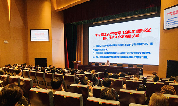 徐之顺从深刻认识加快构建中国特色哲学社会科学的丰富内涵、重大意义和实践要求;深刻把握当前我国哲学社会科学研究的特点和发展趋势;充分发挥江苏哲学社会科学的智库功能和思想库作用等三个方面展开。徐之顺指出,在新的起点上,要将习近平总书记关于哲学社会科学的重要论述作为开展哲学社会科学研究的纲领性文件。要把握方向,坚持马克思主义的指导地位,把马克思主义立场、观点、方法贯穿哲学社会科学各学科各领域,转化为清醒的理论自觉、坚定的政治信念、科学的思维方法。要多出成果,为构建中国特色哲学社会科学贡献江苏智慧。要服务发展,聚焦改革发展中的重大理论和现实问题,开展前瞻性、战略性、针对性研究,注重发挥新型智库的作用,把理论研究和实践探索更好地结合起来,为党委政府科学决策提供参考。