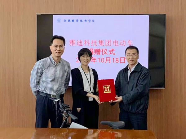 10月16日下午,雅迪科技集团有限公司捐赠仪式在我校举行。雅迪科技集团有限公司人力资源部部长余萍、校长龚方红、艺术与设计学院党总支书记罗嘉军等相关负责人共同参加了捐赠仪式。