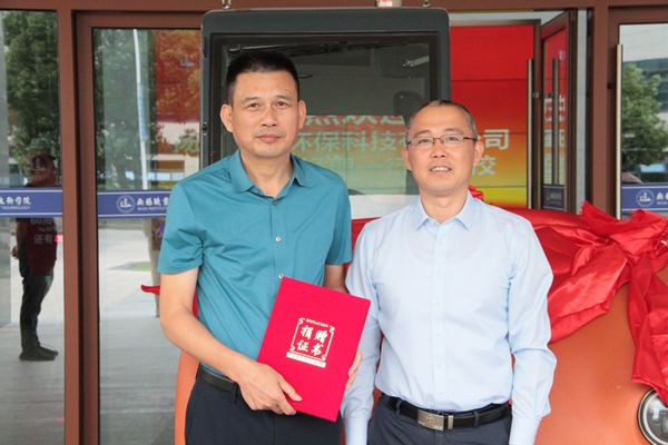 捐赠仪式上,冯为民代表公司为学校捐赠扫地车一台,强伟纲副校长代表学校接受了捐赠,并为扬州金威环保科技有限公司颁发了捐赠证书。