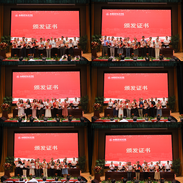 全体校领导为受表彰人员颁发荣誉证书并献上鲜花。