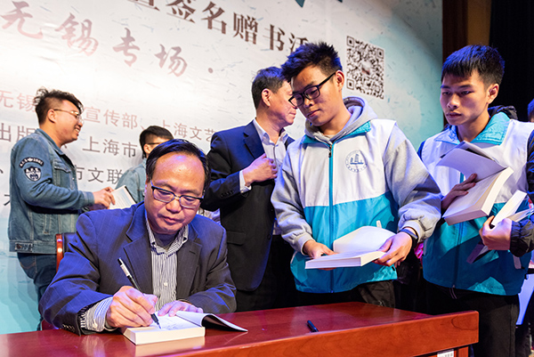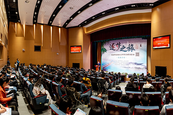 杨雪琴副校长代表学校致欢迎辞,市人大常委会副主任、党组副书记朱民阳讲话,上海市现代领导进修学院院长潘振秋、百花洲文艺出版社上海中心主任郝玮刚先后致辞。活动现场座无虚席,过道也站满了学生。作家安谅携《逐梦之旅》《你跑什么跑》《也许只见一面》等作品与读者见面。无锡歌舞剧团、无锡广播电台、上海师范大学音乐学院等多位艺术家汇聚一堂,以朗读的形式与大家共读安谅作品,演唱由安谅作品改编的歌曲,赢得了现场读者的阵阵掌声。诵读结束后,作家安谅向无锡市作协、无锡市图书馆、“吴韵书香”梁溪书院、阅享文化艺术中心和我校等5家单位赠送了他的作品集,并和现场读者分享了创作体会。最后,安谅先生还现场进行了签名赠书。