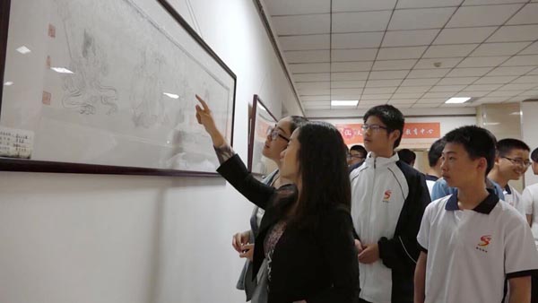 同学们参观校园艺术展作品