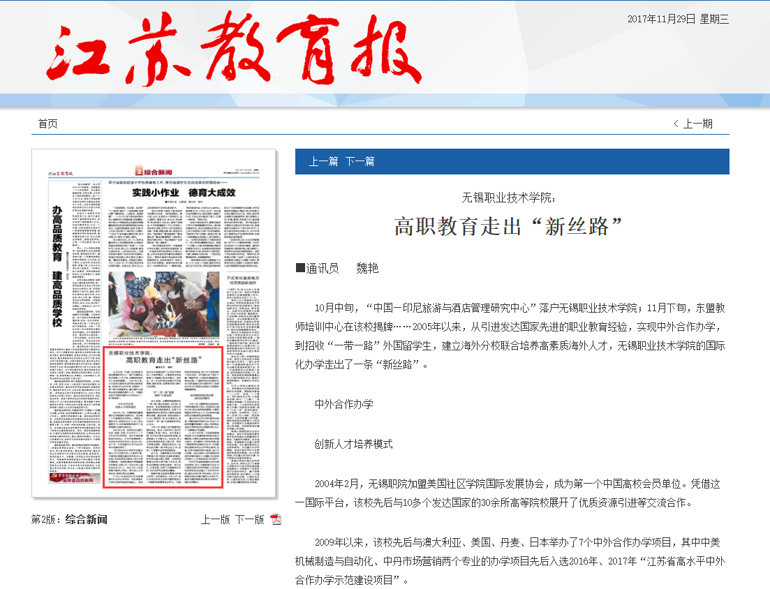 11月29日出版的《江苏教育报》第2版,以《球友会app最新版下载:高职教育走出“新丝路”》为主题,报道了我校国际化办学新经验,在省内同行中引起广泛关注。