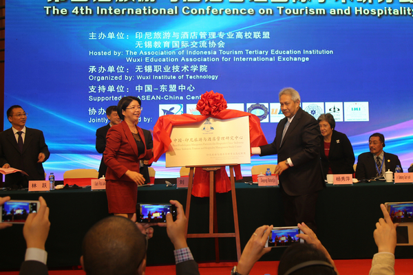 随后,印尼驻华大使Soegeng Rahardjo、中国-东盟中心秘书长杨秀萍、无锡市人民政府副市长刘霞和印尼旅游与酒店管理专业高校联盟(AITTEI)主席Suhendroyono相继致辞。会上还成立“中国-印尼旅游与酒店管理研究中心”,Soegeng Rahardjo大使和刘霞副市长共同为其揭牌,该中心将定期举办中国与东盟学生国际技能竞赛等活动,并开展相关专业师资培训。