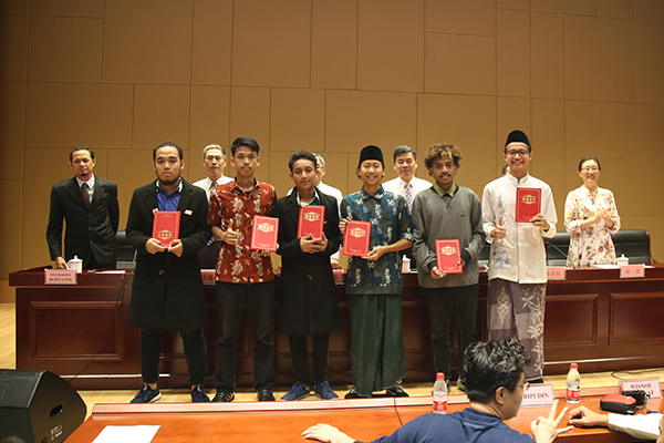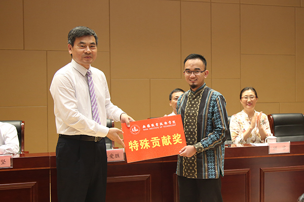 开学典礼上还对品学兼优的留学生进行了表彰,顾京副校长宣读了表彰决定,全体校领导为留学生颁发获奖证书及奖学金。2015级陈文殊同学参加“同乐江苏”外国人汉语演讲比赛获得苏南赛区三等奖,朱爱胜书记为其颁发特殊贡献奖,老生们的优秀表现为新生树立了良好的榜样。