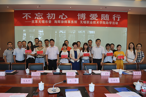 9月5日下午,民革无锡市委携手海辉律师事务所来我校开展“不忘初心 博爱随行”助学活动。无锡市政协副主席、民革无锡市委主委张丽霞,民革市委副主委兼秘书长王晋,民革市委相关处室负责人,海辉律师事务所主任李风和党支部书记冯玉平一行6人出席了活动,我校党委朱爱胜书记、组织统战部长杨雪琴、外语与旅游学院党总支书记王占东参加了座谈会。