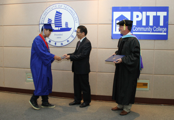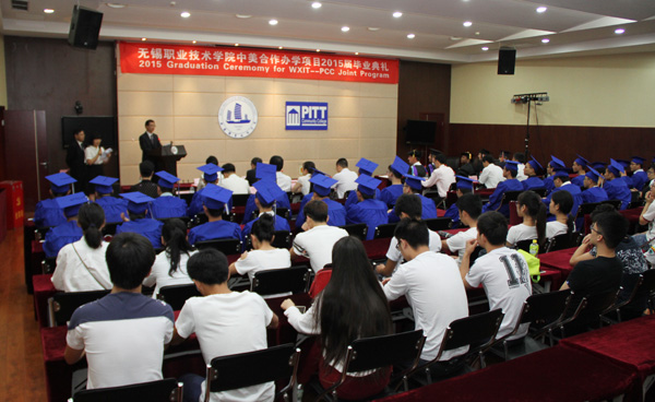 6月26日上午,中美合作机械制造与自动化专业2015届学生毕业典礼在国际交流中心二楼报告厅举行,这是我校第四届中美合作办学项目毕业生,毕业班35名学生中有27人获得合作院校皮特社区学院副学士学位。
