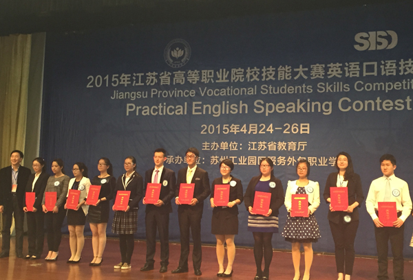 4月25日至26日,省高等职业院校技能大赛英语口语技能大赛在苏州工业园区服务外包职业学院举行,我校外语与旅游学院商务英语61232班牛伟东同学和酒店管理41332班刘铖正同学分别获得英语专业组一等奖和非英语专业组一等奖,创造了我校在该项赛事的最好成绩。