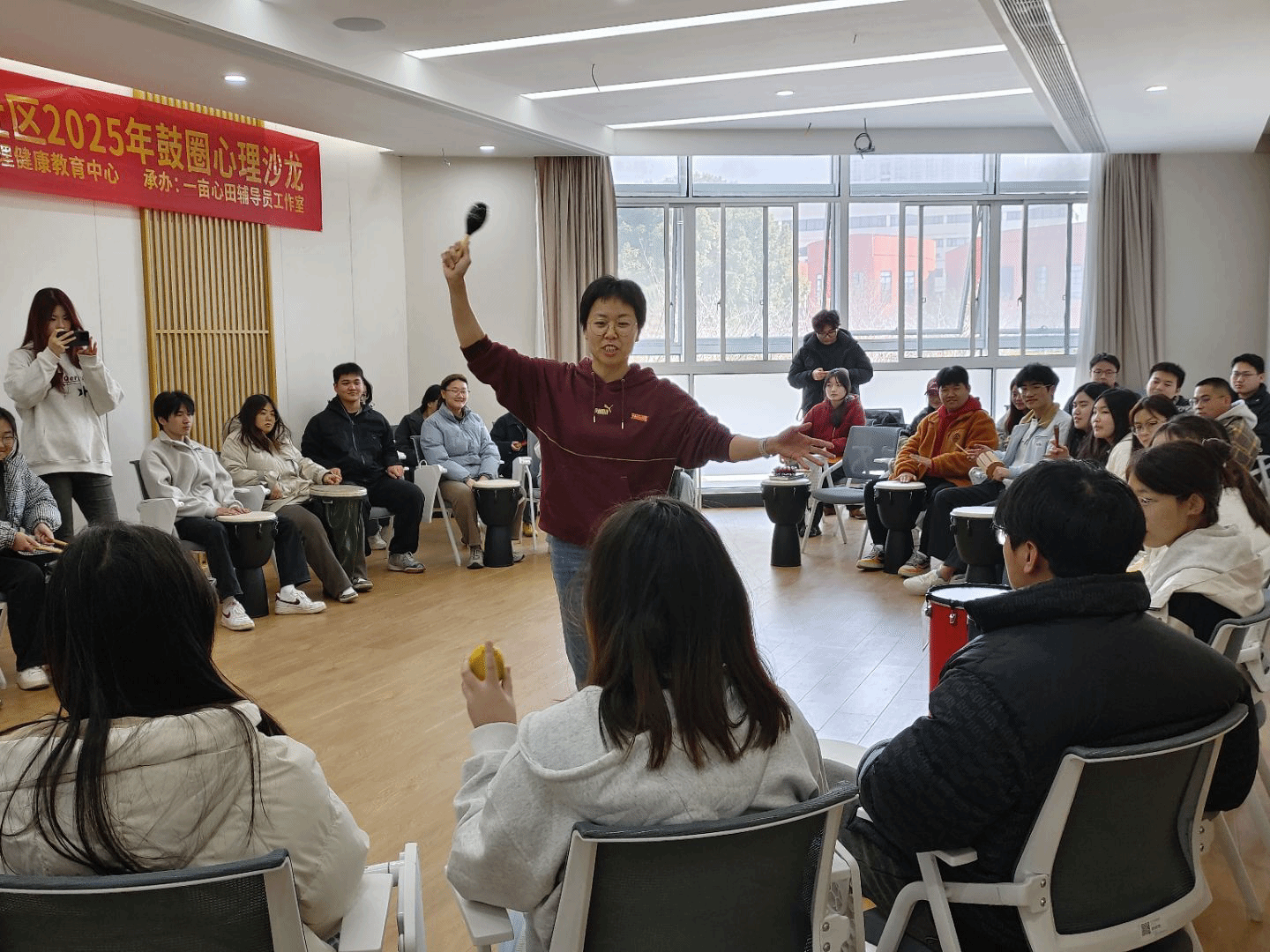 学校大学生心理健康教育中心联合"一亩心田"辅导员工作室,举办了"春动鼓圈,鼓舞心灵"鼓圈团体辅导活动。50余名学生在林佳燕老师的带领下,通过非洲鼓、沙锤等乐器的节奏互动,开启了一场别开生面的心灵疗愈之旅。活动现场气氛热烈,同学们在音乐中释放压力,收获快乐。