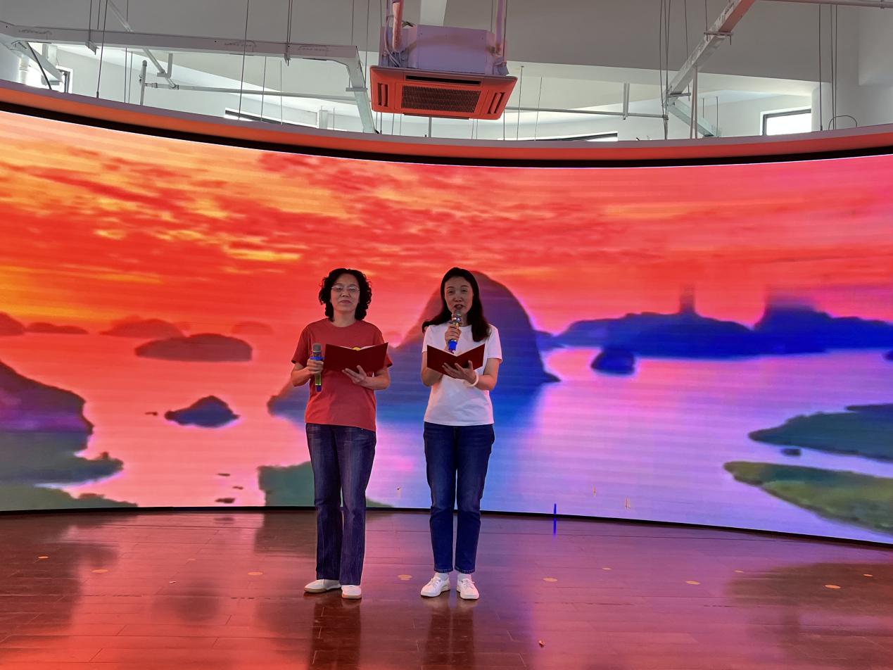 朗诵表演正式开启,两位嘉宾以一首《我喜欢出发》的诗朗诵,将对新征程的向往娓娓道来。随后,双创学院学子接力展现风采。学生会朗诵的《青春》洋溢蓬勃朝气。2024级创新班同学们带来的朗诵作品《青春赞歌》激昂振奋;《红船颂》回溯历史,传递奋斗精神;《月光下的中国》以柔美笔触,抒发对祖国山河的深情。两位嘉宾针对同学们朗诵时的情感表达、节奏把控等进行了专业点评,对气息转换等细节进行了悉心指导。