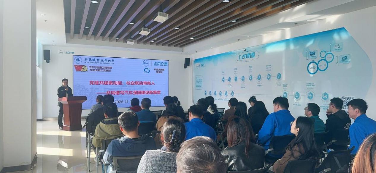为深入学习贯彻党的二十届四中全会精神和习近平总书记关于党的建设的重要论述,巩固拓展主题教育成果,汽车与交通工程学院教工党支部与无锡上汽大通产品支持部党支部,于11月11日联合开展“党建共建聚动能,校企联动育新人——共同谱写汽车强国建设新篇章”主题党日活动。本次活动旨在通过组织联建、理论联学、活动联办,强化党员理想信念教育,锤炼过硬党性作风,并深入企业一线开展实地调研与交流,探索党建引领下校企合作的新模式与新路径,将党的政治优势、组织优势转化为发展优势,为拓展毕业生就业岗位、服务地方经济高质量发展注入新动能。