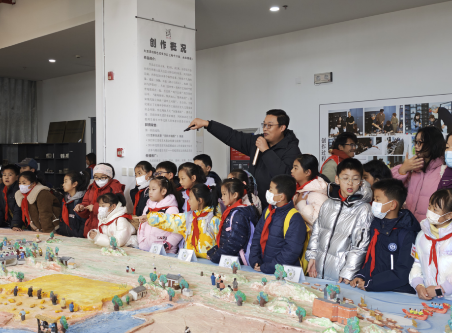 在“吴韵祥瑞图”前,孩子们的目光立刻被巨型大型泥塑场景所吸引——栩栩如生的市井人物、层叠错落的江南建筑、细腻传神的民俗生活,在灯光下泛着温润的光泽。“老师,这座山是雪浪山吗?”“看,这是阿福阿喜!”孩子们围在泥塑展台前,眼中充满震撼与好奇,问题一个接一个地涌出。在王博老师的耐心讲解下,他们不仅了解到泥塑背后“捏、塑、刻、绘”的传统技艺,更通过触摸材料、观察细节,感受到泥土在匠人手中被赋予生命的过程。在紫砂展区,马超越老师用妙趣横生的语言详解紫砂制作工艺、历史渊源,并告诉队员们只有通过千锤百炼才能得到一只“佳品”。队员们认真聆听、踊跃提问,在互动中领略“一壶一世界”的紫砂雅韵,对传统手工艺人的匠心满怀敬佩。生活物语创意工坊内,曹晓丹老师通过沉浸式讲解与微课视频为队员们直观呈现扎染、蜡染的历史渊源、工艺原理与经典纹样演变,让抽象的传统技艺知识变得生动可感,真切体会到传统工艺与现代科技碰撞的奇妙乐趣。