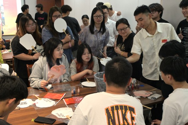 互动环节后是温馨而富有创意的手工制作环节。在场师生使用超轻黏土共同制作代表我国56个民族特色的手工作品,每个作品都蕴含着大家对民族团结的深刻理解和对祖国的深情厚谊,少数民族学生先后将制作的手工作品粘贴在红色民族画板集中展示。同时,建国75周年如“漆”而至,国庆主题漆扇制作体验也让同学们感受到了中国传统工艺的魅力,流动的彩漆在扇面上绘出心中的祖国大好河山和民族团结的美好图景。