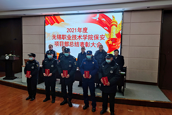 无锡伍创保安公司驻太湖校区保安项目部经理陈秋明代表项目部对2021年度安保工作作总结。校保卫处综合办主任石华对驻校区保安项目部一年的工作进行了讲评,校保卫处处长王振华宣读《关于表彰2021年度先进驻校保安人员的决定》,陈秋明等十名保安队员获得“先进个人”荣誉称号。