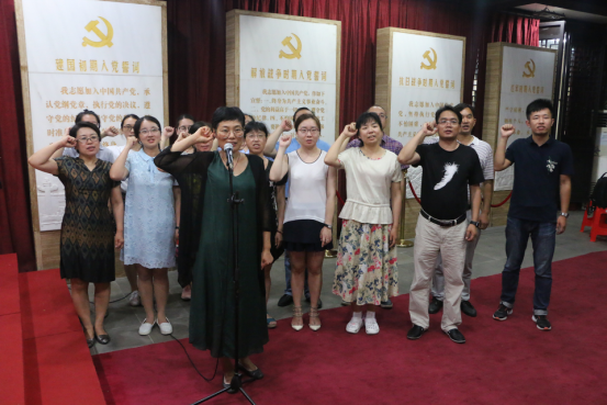 财经学院全体党员观看专题影视片《誓言颂》,片中不同时期的共产党员用鲜血和生命践行着自已的入党誓言,极大地感染了现场的党员同志。回顾无锡的杰出共产党人和无锡革命的光辉历史,党员们对誓词的精神内涵也有了更深刻的认识。随后,全体党员肃立,一起高唱《国际歌》,并在党总支书记吴明芳的带领下,右手握拳面向鲜红的党旗,集体重温入党誓词。一句句铿锵有力的誓言,激荡着每一位党员的灵魂,表达着对党的忠诚和不忘初心的庄严承诺。最后,党员同志们参观了无锡第一支部会址群雕、入党誓言碑等历史遗迹。每一件遗迹都承载着党的一段历史,让党员们备受鼓舞。