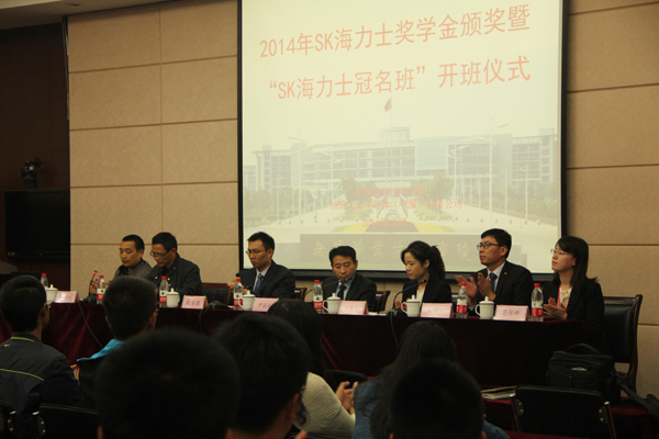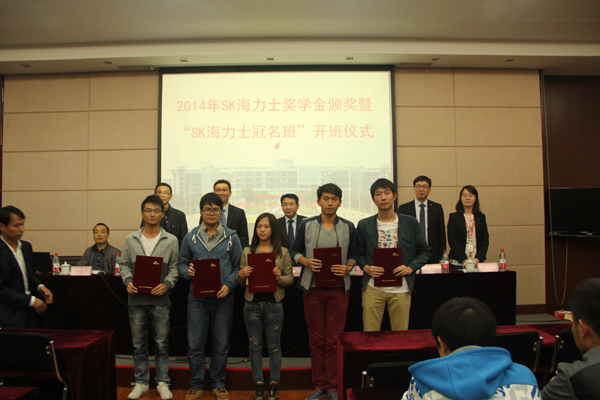10月28日下午,物联网技术学院在国际交流中心二楼报告厅举行2014年度SK海力士奖学金颁奖典礼。SK海力士半导体(中国)有限公司的人力部部长尹国汉、招聘次长金峰一,物联网学院领导郭再泉、刘全胜、蔡建军及海力士冠名班学生、电子类专业教师出席了颁奖仪式。