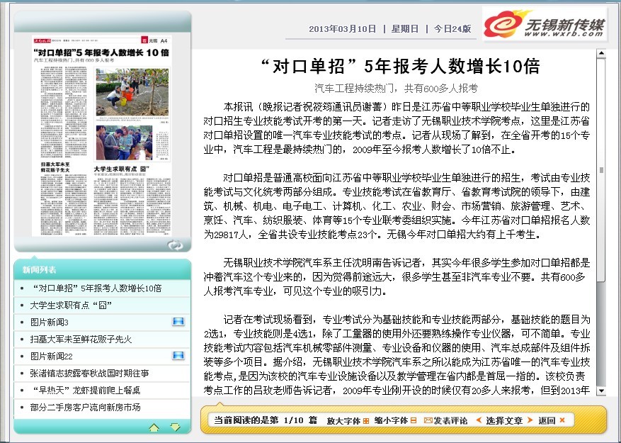 事实上对口单招一直是高考体制改革的试点项目之一,普通中专、职业中专、职业高中、成人中专、技工学校等校的应、往届毕业生均可以报名,为很多孩子开辟了第二条进入高校的大道。无锡汽车工程学校从2008年就有第一批20多名学生参加对口单招考试,第一次参考的本科率就超过了30%。一名从高中转来就读中职校的学生就从对口单招考入了一所本科院校。对口单招越来越受到中职学校考生的欢迎。而且根据江苏省的相关政策,今后还将进一步扩大对口单招的招生数量,这对很多无缘高中的学生来说,是进入大学的一道完美阶梯。据了解,2013年江苏省对口单招专业技能考试的日期为3月9日———25日,各专业技能考试的具体日程由各专业联考委统筹安排确定。专业技能考试成绩将于4月2日下发各市,专业技能成绩合格且参加文化统考的考生方可参加对口单招志愿填报。