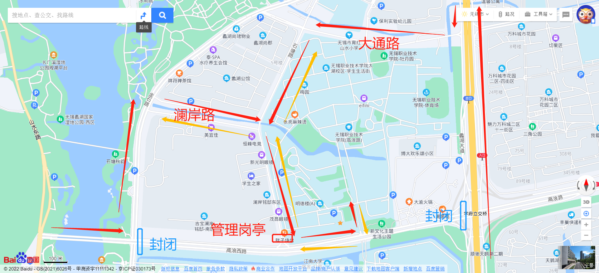 无锡市城市重点建设项目管理中心通知,因高浪西路(蠡湖大道至缘溪道)快速化改造施工,高浪西路(蠡湖大道至缘溪道)将于5月14日晚9点起全封闭施工,施工周期2年。根据施工组织安排,5月15日至6月中旬,我校人员进出路径为石塘路(左拐)-高浪路-校南门(如下图所示)。为防止社会人员及车辆进入封闭区域,建管中心将于石塘路与高浪路接口处设立管理岗亭,届时说明是学校工作人员即可通行。6月中旬后,将开通高浪西路蠡湖大道口至我校南门的通道,该道路已经在建设中。此外学校正与无锡市相关部门积极协商开通其他进出校通道,确保我校师生正常出行。
